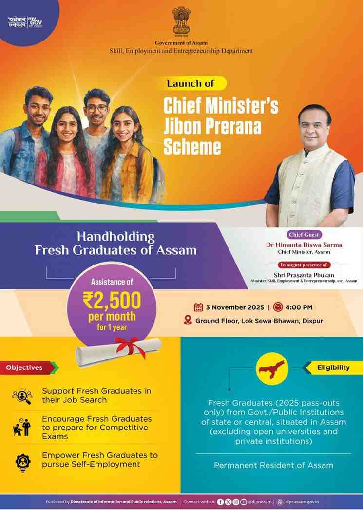 The Chief Minister’s Jibon Prerana Scheme is a new financial assistance programme launched by the Government of Assam to support fresh graduates and research scholars. It offers ₹2,500 per month for one year to fresh graduates (2025 pass-outs) and a one-time grant of ₹25,000–₹50,000 to research scholars to help them in job search, competitive exam preparation, or self-employment.